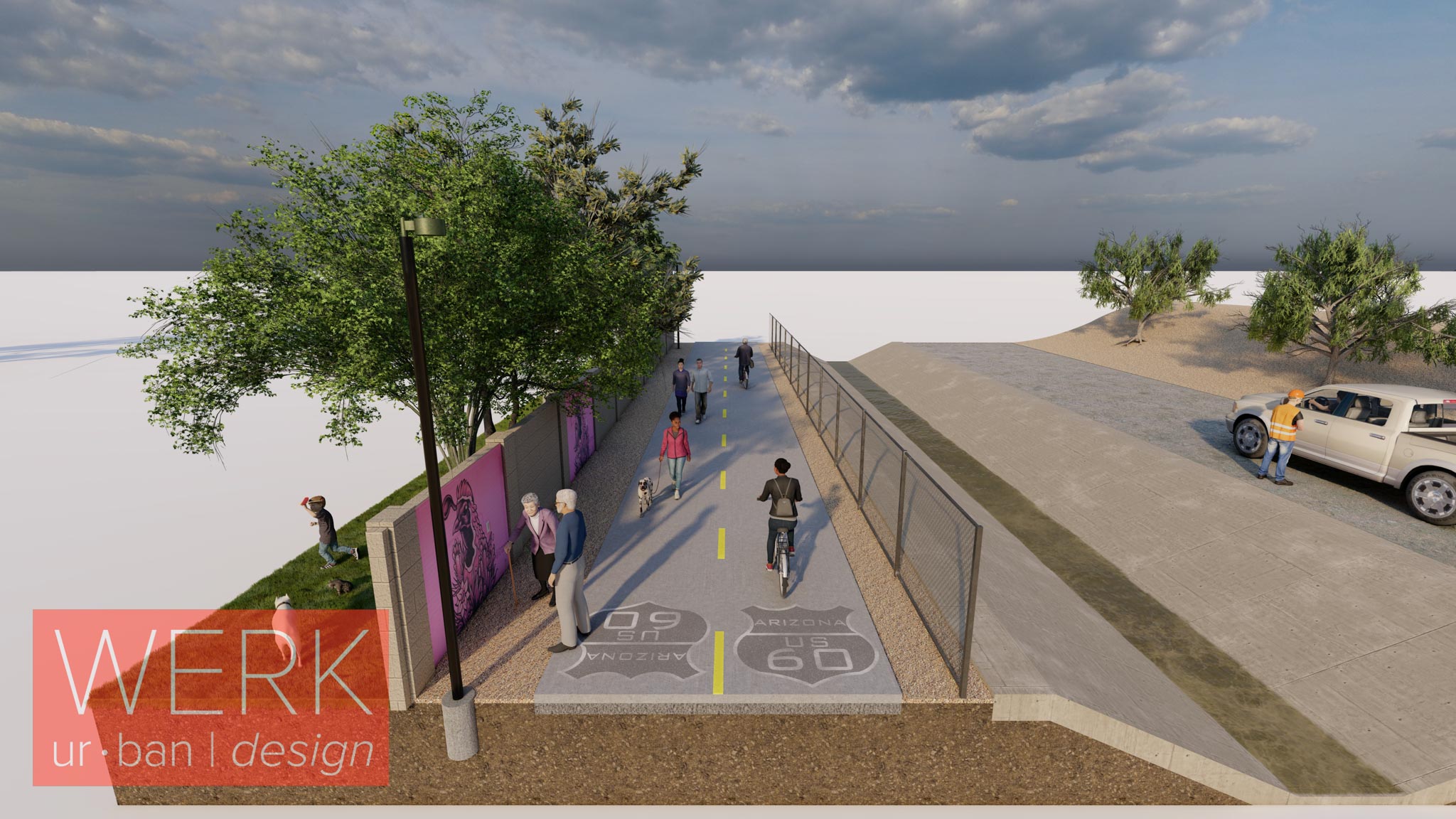 WERK | urban design is collaborating with the Y2K Team on the US 60 Shared Use Path project, focusing on pathway alignment and landscape design through the existing Harmony Park and several smaller basin parks. WERK is helping shape a low-impact, cost-effective landscape plan that balances function and placemaking. Enhancements include prefabricated fencing, community murals on residential walls, and sandblasted concrete markings to enrich the user experience without significantly increasing costs.